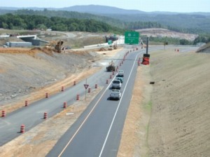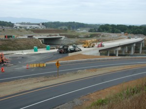![]() Christiansburg -- Looking west from the Yellow Sulphur Road overpass. The lanes in the foreground are eastbound U.S. 460 Bypass; the lane with the barrels is the acceleration lane for the ramps from North Franklin Street (U.S. 460 Business). The other lanes are U.S. 460 Bypass West and the exit ramp to U.S. 460 Business West. The overpass in the far distance will carry northbound North Franklin Street over the entrance and exit ramps, then the lanes will split into an on-ramp for westbound traffic to the bypass and and a continuation of North Franklin Street. |