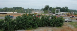 ![]() Christiansburg -- Looking west from the Yellow Sulphur Road overpass. The lanes in the foreground are eastbound U.S. 460 Bypass; the lane with the barrels is the acceleration lane for the ramps from North Franklin Street (U.S. 460 Business). The other lanes are U.S. 460 Bypass West and the exit ramp to U.S. 460 Business West. The overpass in the far distance will carry northbound North Franklin Street over the entrance and exit ramps, then the lanes will split into an on-ramp for westbound traffic to the bypass and and a continuation of North Franklin Street. |